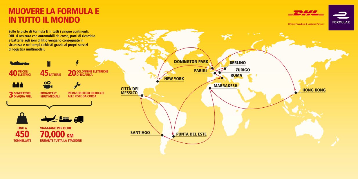 DHL è responsabile di tutte le movimentazioni logistiche per i 10 team in gara e per tutte le infrastrutture della Formula E. Per trasportare la Formula E in tutto il mondo nel modo più efficiente possibile, riducendo al minimo l'impronta di carbonio del campionato, DHL ha progettato un approccio multimodale appositamente adattato, integrando il trasporto aereo con le linee ferroviarie, stradali e marittime.