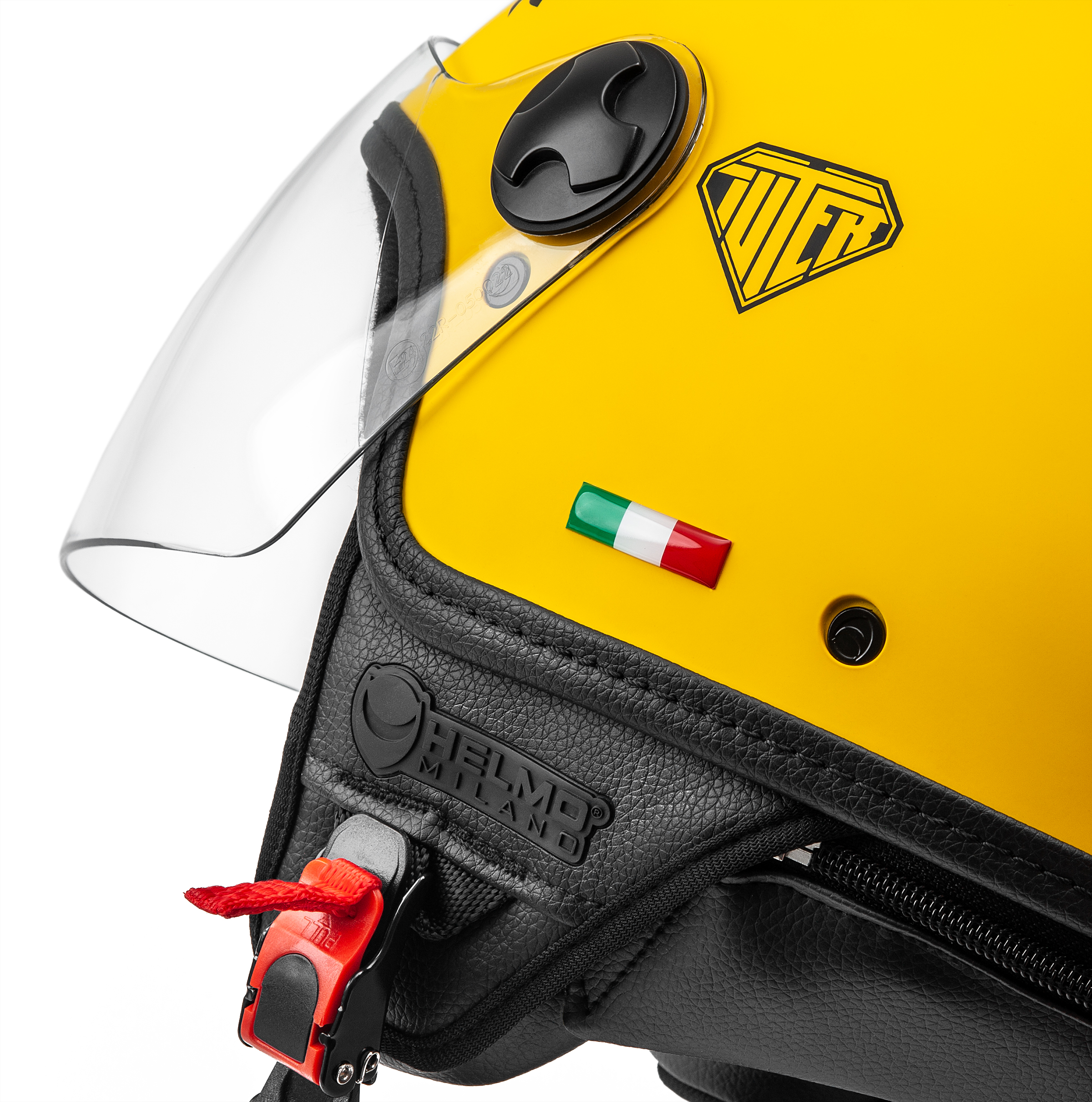 L'interno del casco è stampato con il pattern “Tiger Camo” dalle tonalità gialle e nere. Il casco presenta i loghi IUTER ai lati, mentre il marchio Helmo Milano tono su tono, è cucito sui guancioli laterali con predisposizione bluetooth. Il modello è dotato di visiera lunga in lexan.