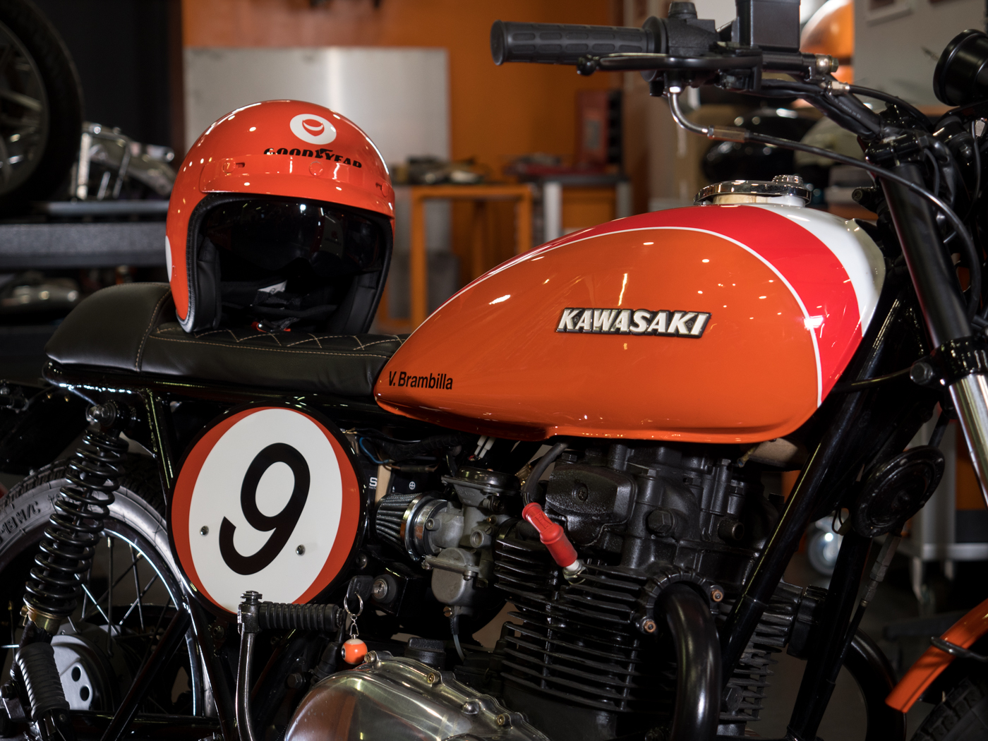 Proprio un jet Helmo Milano Audace Monza, è stato la base per realizzare il casco Helmo Milano Replica Vittorio Brambilla, completamente arancione. Lo stesso colore della “special” su base Kawasaki Z400 preparata dai F.lli Brambilla, Carlo, Roberto e Lella, proprietaria della moto. Figli di Vittorio Brambilla, noto pilota di F.1 vincitore del GP d’Austria nel 1975, ma prima ancora motociclista di razza. Non molti sanno che vinse il Trofeo Cadetti/Juniores classe 175 nel 1958 con una Parilla, mentre nel 1969 con l’Aermacchi ottenne il terzo posto nel Campionato Italiano Classe 350cc dietro a Pasolini (Benelli) e Milani (Aermacchi), ma davanti ad Agostini (MV) e corse a Imola il GP della Nazioni nella classe 500. Sempre nel 1969 ottenne il suo traguardo più prestigioso, quale pilota della squadra ufficiale Moto Guzzi che stabilì a Monza diversi record di velocità con il prototipo V7 Record derivato dalla V7 Special e progenitore della V7 Sport. Brambilla fu anche 3°nel Bol d’Or del’71 in coppia con Mandracci, sempre su Moto Guzzi.