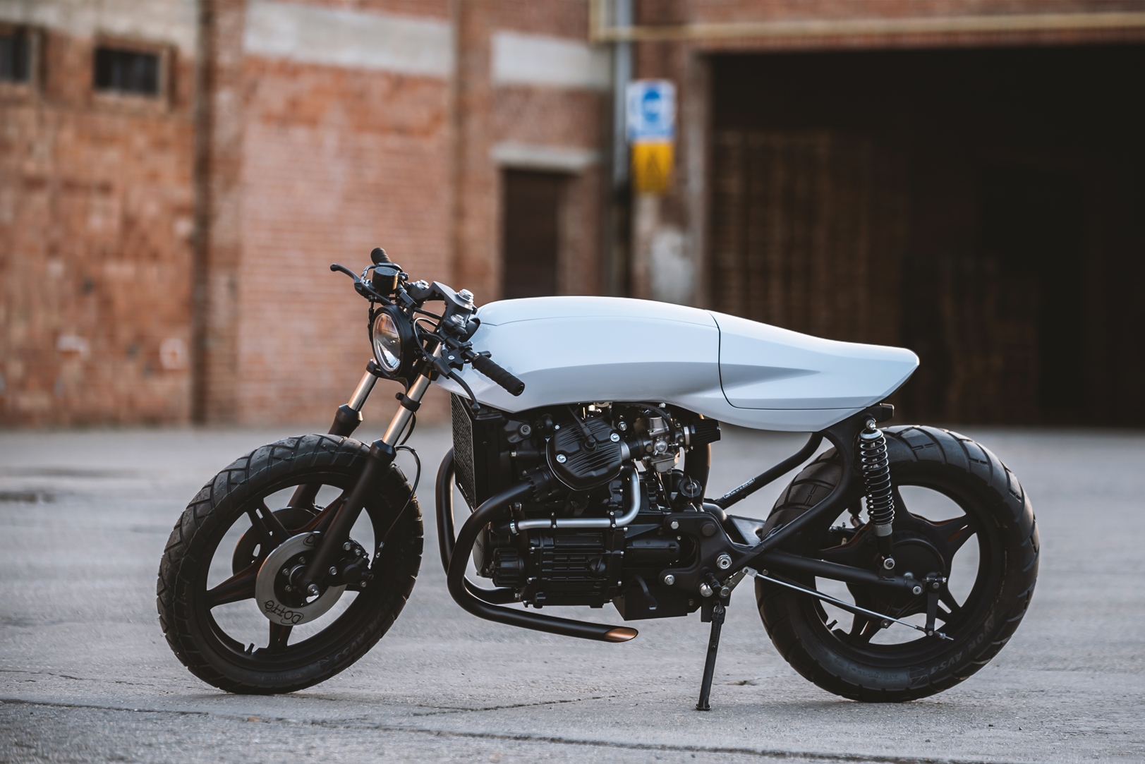 Biancaneve nasce da una Honda CX500 del 1979, smontata pezzo per pezzo, portata al metallo nudo e restaurata - accorciando il telaio - fino a riportare la meccanica alla sua affidabilità e splendore originale. Parallelamente è stato disegnato un nuovo vestito, che enfatizza un’interazione uomo-motoveicolo rivoluzionaria, reinventando l’esperienza dell’utente. Il look “body in white” contrasta con il nero del telaio, dei cerchioni, del motore, dei due terminali di scarico artigianali su misura progettati da DOTTO Creations.