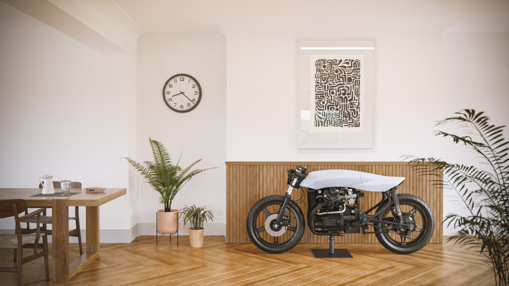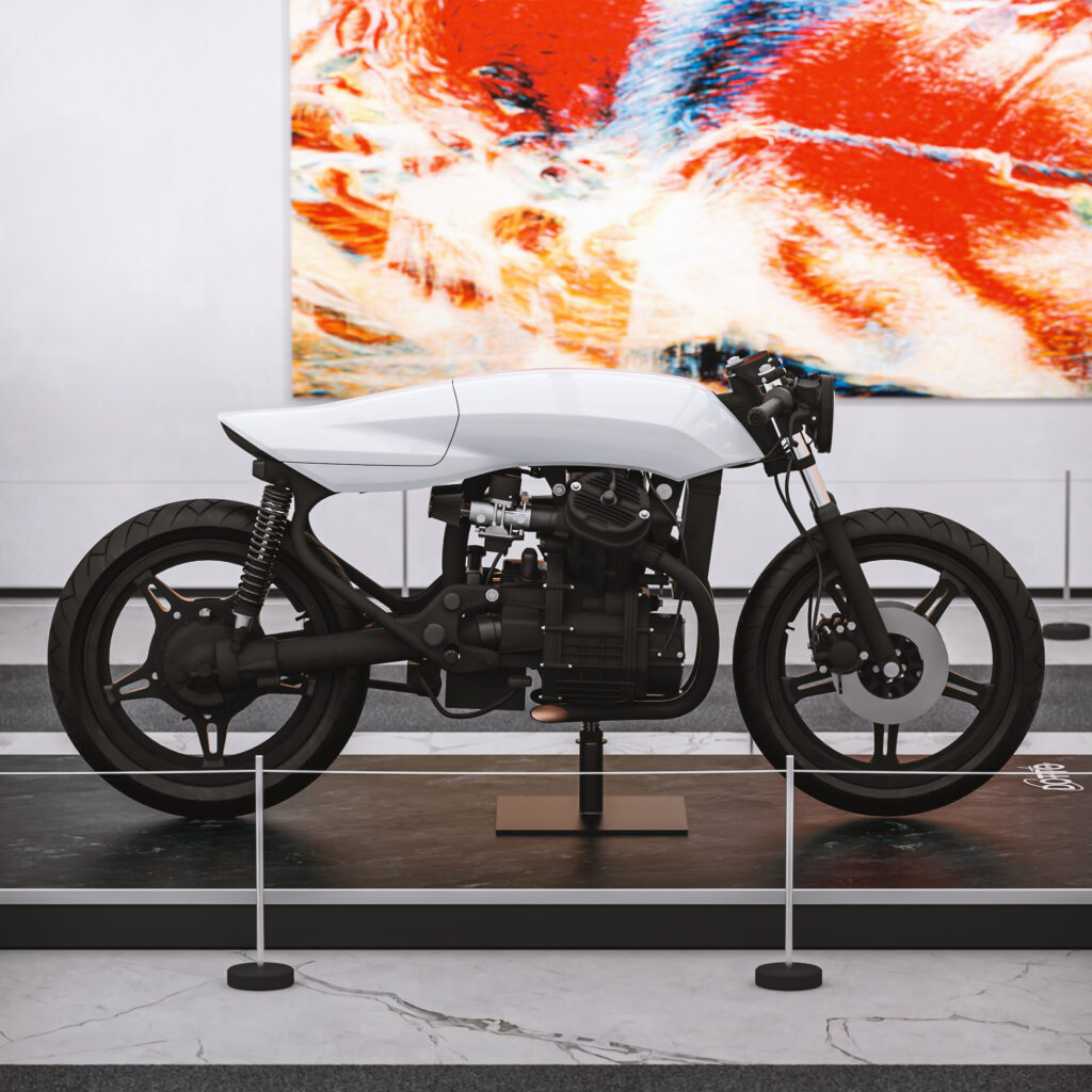 - quello statico, da scultura moderna, il cui bianco richiama il marmo di Carrara dei capolavori del Bernini. Quando è parcheggiata è un simbolo, esprime i tratti della personalità del proprietario. Un certo modello può svelare la passione per l’avventura, oppure la ricerca della velocità estrema per un pilota innamorato delle performance super sportive. Ma una moto può anche rappresentare la voglia di avere un prodotto cucito su misura, in base alle proprie necessità e/o passioni, come nel caso delle cafè racer e dei chopper.