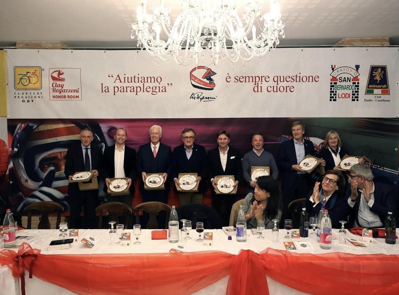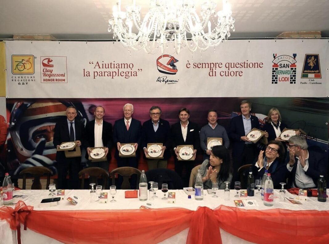 Thierry Boutsen, Andrea Montermini, Christian Pescatori, Thomas Biagi, per citare solo i piloti, ma aggiungiamo anche Giancarlo Minardi, la famiglia Regazzoni e Didier Debae, manager di esperienza nel mondo delle corse. E’ al loro cospetto e alla presenza di numerosi soci e altri ospiti, che si è celebrata la consueta serata del Club Clay Regazzoni per consegnare i fondi raccolti agli istituti ospedalieri che operano nell’ambito della paraplegia, per cercare di dare cura e supporto a coloro che si trovano a vivere questa condizione. Fu proprio Clay Regazzoni dopo il drammatico incidente di Long Beach nel 1980, con l’intento di fare qualcosa di concreto per aiutare chi si trovava nella sua situazione, a dare vita al club assieme all’amico Giacomo Tansini, poi supportato da Don Lugi Avanti; sempre sostenuti dalla famiglia Regazzoni alla scomparsa di Clay.