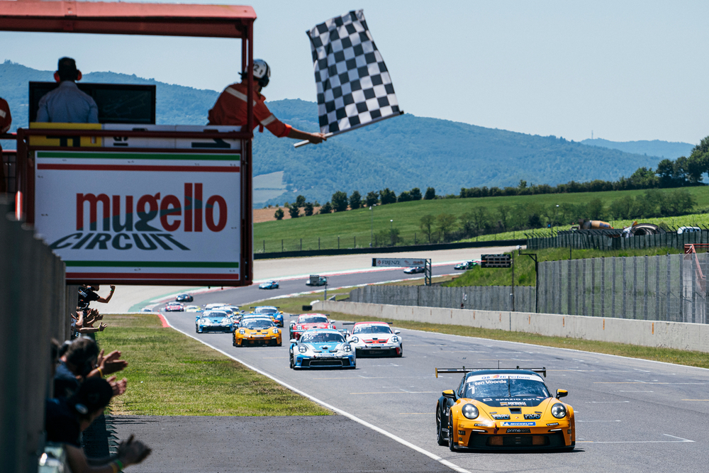 C’è la firma di Larry Ten Voorde sulla chiusura del vibrante terzo round della Porsche Carrera Cup Italia andato in scena al Mugello Circuit con 33 911 GT3 Cup schierate al via e un tasso adrenalinico in continua ascesa per le numerose sfide che hanno messo a confronto 14 team e i migliori interpreti di un monomarca sempre più di livello internazionale. Nella gara 2 che ha completato la tappa di metà campionato, l’asso olandese di Enrico Fulgenzi Racing – Centro Porsche Udine ha centrato il quarto successo stagionale e allungato ulteriormente in classifica generale, nella quale ha marcato punti molto pesanti anche Marvin Klein. Il campione francese di Target Competition – Centro Porsche Bolzano aveva vinto gara 1 sabato scattando dalla pole position dopo l’ottimo crono fatto segnare in qualifica in 1’49”772 precedendo proprio Larry Ten Voorde e domenica anche gara 2 ha vissuto sul duello tra i due, stavolta con successo del campione in carica. Il primo colpo di scena della corsa, però, ha riguardato Diego Bertonelli proprio a inizio gara. Il pilota toscano di The Driving Experiences – Centri Porsche di Roma scattava dalla prima fila al fianco di Ten Voorde, ma una partenza anticipata pur rimanendo all’interno della casella sulla griglia gli è costata 5 secondi di penalità, scontati appena tagliato il traguardo in terza posizione, “convertita” in un 13esimo posto nella classifica definitiva. Già alla prima curva Bertonelli ha tentato l’attacco a Ten Voorde, ma ritrovatosi sul cordolo all’uscita della San Donato ha dovuto desistere, mentre Klein è stato velocissimo ad approfittarne per sopravanzare l'italiano e mettere subito pressione all’olandese.