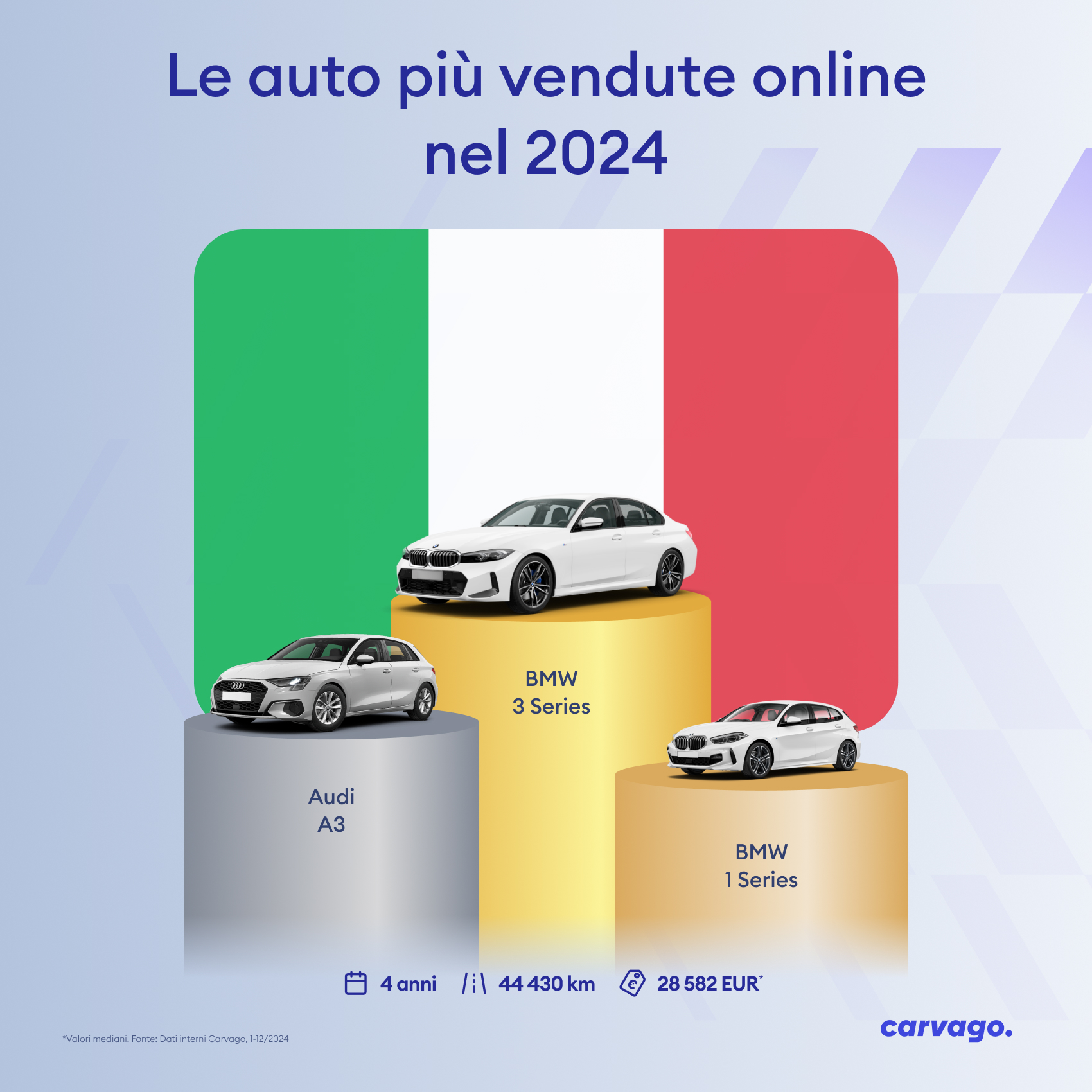"In Italia, l'auto usata più venduta online lo scorso anno è stata la BMW Serie 3. Il leader nel nostro mercato è tradizionalmente la Fiat, ma si vede che i clienti che acquistano online hanno preferenze diverse. Su Carvago gli italiani acquistano auto più costose con un chilometraggio mediano basso pari a 44.430 chilometri, il che conferma le loro elevate esigenze in termini di qualità e standard dell'auto. L'atteggiamento esigente della clientela italiana emerge anche dal prezzo mediano delle auto vendute, pari a 28.582 euro", riferisce Antonio Gentile, Country Manager Carvago Italy.