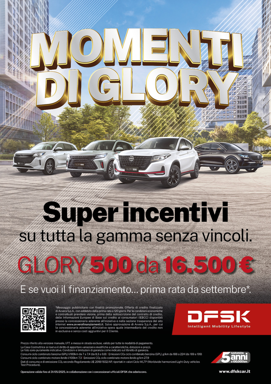 Prato, 6 maggio 2025 - China Car Company, importatore e distributore ufficiale in Italia dei modelli DFSK, presenta la nuova campagna promozionale “Momenti di Glory”, che prevede super incentivi su tutta la gamma senza vincoli. Questa nuova campagna è in vigore fino al 31 di maggio 2025, in collaborazione con i concessionari ufficiali DFSK che vi aderiscono.