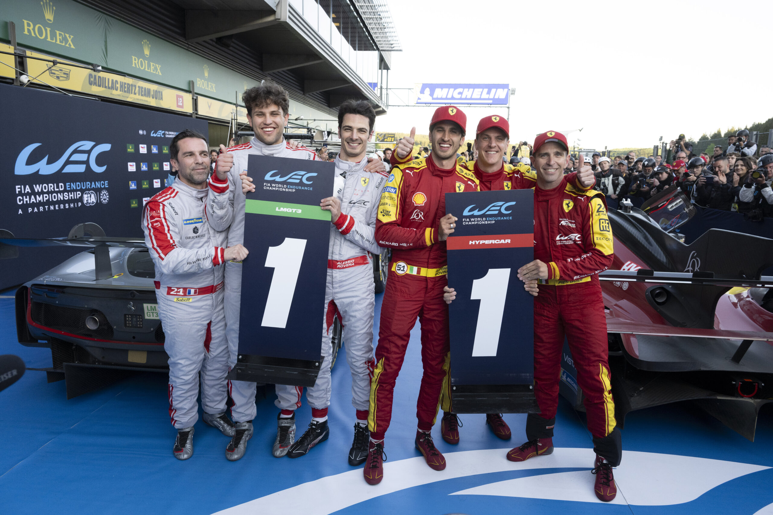 Il Cavallino Rampante consolida così il primato sia nella classifica iridata Costruttori sia nella graduatoria Piloti al termine di un weekend che ha registrato, a Spa, oltre 98 mila presenze in tribuna. A completare la festa ferrarista il successo della 296 LMGT3 numero 21, e il terzo posto della 54, entrambe iscritte da Vista AF Corse, nella classe riservata alle vetture derivate dalla serie.